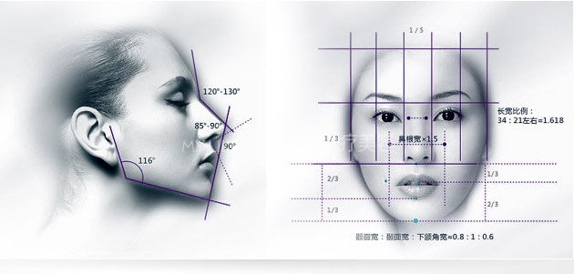从鼻子的生理美学角度出发的,要对称、角度适合、鼻梁的高度和宽度比例适当,再从鼻子与整个面部,乃至整个身材,以及个人的气质、职业习惯等等联系起来,可以推导出鼻子的和谐曲线,这是个感性的判断,需要对人体美学和面部美学、心理美学等有精深的把握。这是一种考虑鼻体结构的几何美感,兼顾鼻体与人体面部及气质等和谐共存,并产生浑然天成的自然美感的处理方式。鼻子长度的2/3是鼻子的高度.另一方面,鼻子与颜面的角度,男性是36度,女性是34度.鼻翼的宽度大约在两内眦的垂直线之间,鼻骨的宽度要小于两内眦的距离。